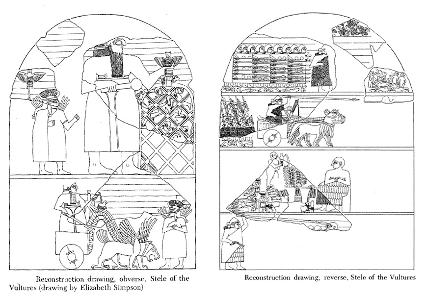 Obverse side, god Nigirsu depicted on "The Stele of the Vultures of Eannatum, ensí of Lagash (circa 2460 BC)," found at Tello, ancient Girsu, Paris, Musée du Louvre.